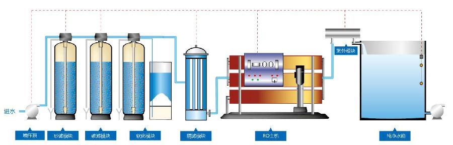 增壓泵→多介質過濾→果殼活性炭過濾器→軟化過濾→精密過濾→RO主機→紫外線殺菌裝置→不銹鋼水箱
